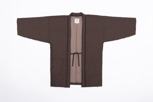 Hanten is a classic Japanese housecoat, originally invented as an outerwear layer for workmen in the 18th century. With its padded cotton fill, Hanten offers warmth and comfort whether you choose to wear it indoors or out.