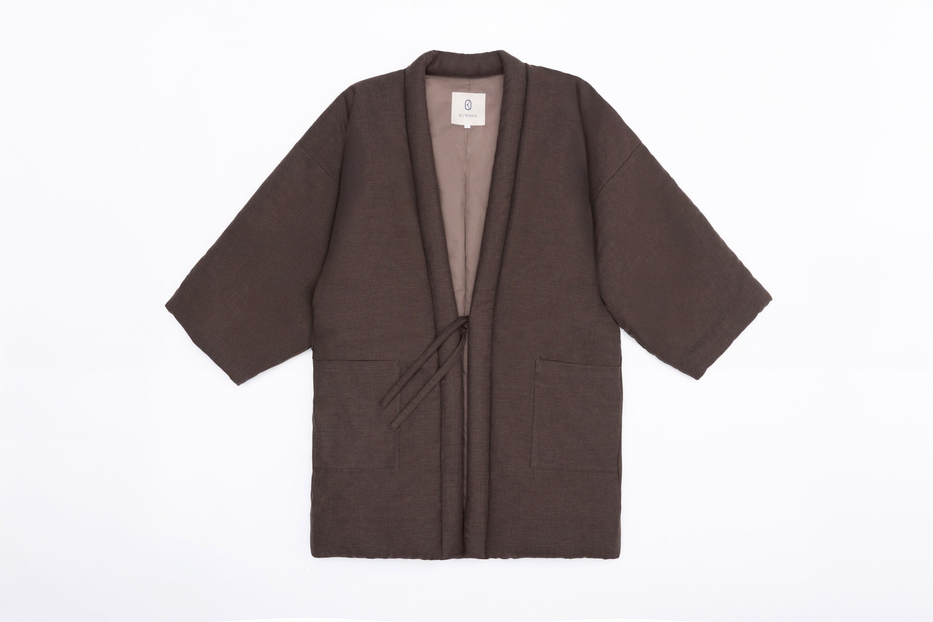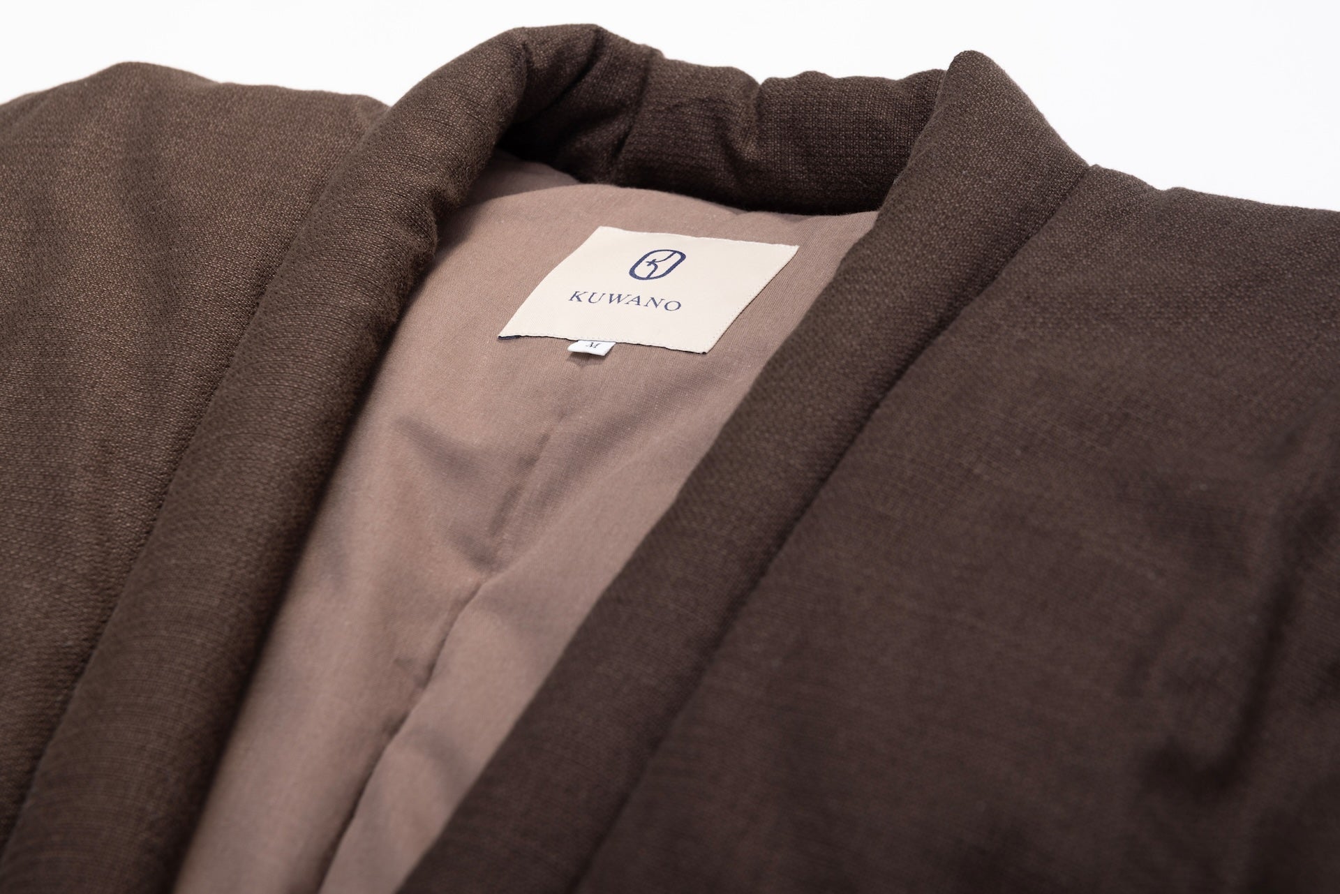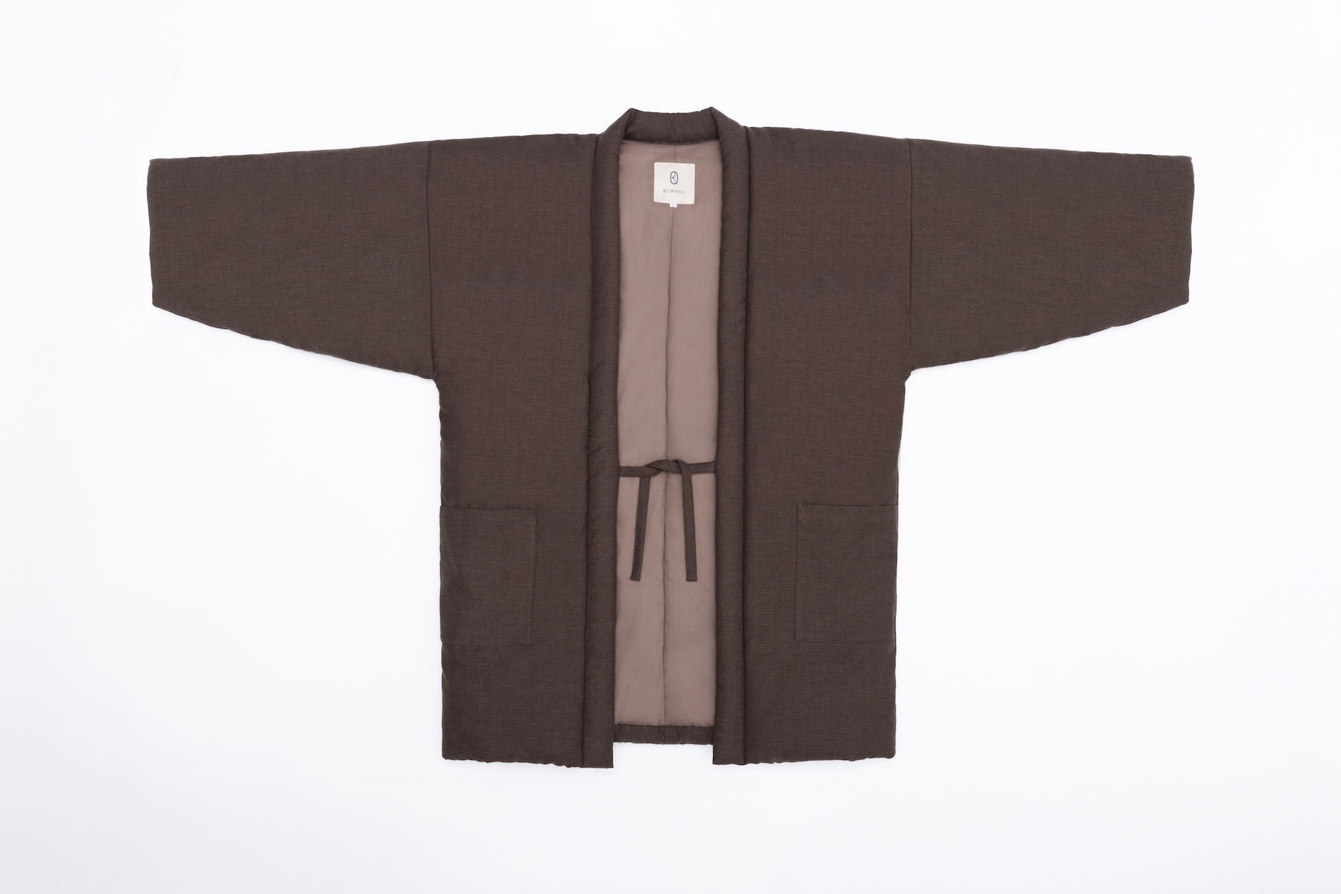 Cha is a Hoji tea Brown hanten, our own modern twist to the traditional robe.
